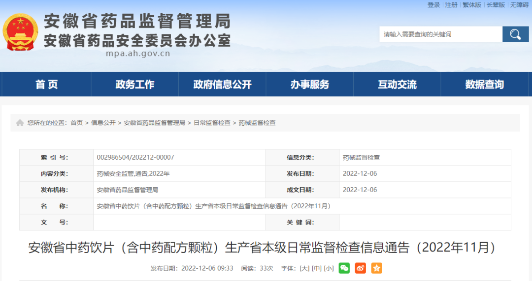 【概要描述】12月6日,安徽省藥監(jiān)局發(fā)布1則中藥飲片(含中藥配方顆粒)生產(chǎn)省本級(jí)日常監(jiān)督檢查信息通告。
